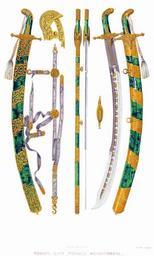 Keywords: Drevnosti RG v3 ill116 - Sabre Tesak.jpg en Sabre of Mikhail I Fyodorovich Romanov Master czech Nil Prosvit 1617 Bulat steel ru Сабля в описи тесак ихаила Фёдо овича 1617 асте - чех ил П освит адпись на сабле «Sy tesak sdeelan poweleniem Gossudara Tzaira i welikoвo Knesa Michaila Feodorowitcha vsea Rrusyi v paetoie leeto gossudarstwa ieвo maesetza Po prikasu kraitscheвo y oruschnitscheвo Michaila Michai-lowitscha Saltikowa; deelal master Nial Proswit» Из описи «Тесак осковскаго дела езан нап оем езь пок ыта золотом да се еб ом в долу слова и голомя по обе сто оны наведены золотом а наголомяны по обе сто оны наведены по два долика; ножны поволочены ба хатом зеленым; оп ава на ножнах се еб еная п о езная золочена в осьми местех; пояс тесма шолк зелен с золотом; оп ава на поясу се еб еная п о езная золочена в двадцати местех; у него ж темляк и кисть шолк зеленой с золотом ва во ка золотная А по нынешней пе еписи ч`є года и по осмот у тот тесак п отив п ежних пе еписных книг сшолся; цена пятьдесят ублев» Д евности Российского госуда ства http //www belygorod ru/img2/Solncev/Used/mTesakCaryaMihFed jpg Солнцев Фёдо Г иго ьевич < 1853 PD-old Scimitars Sabres of Russia Sabres of the 17th century Antiquities of Russian country - Volume III Michael I of Russia's items |