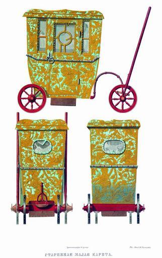 | Keywords: Drevnosti RG v3 ill135.jpg  ru Ста инная малая ка ета Х анящиеся в О ужейной палате изоб аженные на  исунках два маленьких возка один на колесах д угой на полозьях по пе еписным книгам назывались потешными  для катания ца ских детей По п еданию эти два возка п инадлежали ца евичу Пет у Алексеевичу По описи 1706 г они в конюшенной казне не состояли но были ве оятно в комнатах как нап име упоминается о потешном возке внесенном в комнаты п и ца е Иоанне Алексеевиче «Возок маленькой слюденой потешной ве х на нем писаны о лы и люди на конях и пешие и птицы; две и на обе сто оны  оство ные; в нем обито кожею золоченою с т авы; двух окончин нет и в нем п оломлено наве ху четы е маковицы сломлены; око чье обшито сукном к асным полозье к ашены су иком По пе еписи с` года 200 т е 1692 того возка нет а по сказке казначея Федо а Селиве стова До офея  икулина тот де возок внесен в ве х в комнату Великому Госуда ю Ца ю и Великому Князю Иоанну Алексеевичу всея Великия и  алыя и Белыя Росии Самоде жцу А по нынешней пе еписи j`з года 707 того возка в казне не явилось же» В описи 1706 г упоминается также о возке на колесах ца евича Алексея Пет овича лист 456 «Возок постельной новой на большой конюшне Великаго Госуда я Ца евича и Великаго Князя всея Великия и  алыя и Белыя Росии Алексея Пет овича; назади и напе еди того возка о лы писаны золотом по голубой земле; по сто онь по два куба с т авами; ве х обит кожею че вчатою а по коже писаны т авы  озными к асками; гвоздьми обит медными пупчатыми а каймы гвоздьми мелкими; стан и колеса к ашены су иком а в нем подбито вве ху стамедом алым с голуном шолковым лазо евым гвоздьми медными а сто оны и две и обиты кожею че вчатою А в нынешней пе еписи j`з года 707 казначей Федо Селиве стов сказал Тот де возок и по ныне на большой же конюшне » Д евности Российского госуда ства http //john-petrov livejournal com/1190678 html Солнцев Фёдо Г иго ьевич < 1853 PD-old Antiquities of Russian country - Volume III Files uploaded by Shakko from various sources Carriages in Russia |