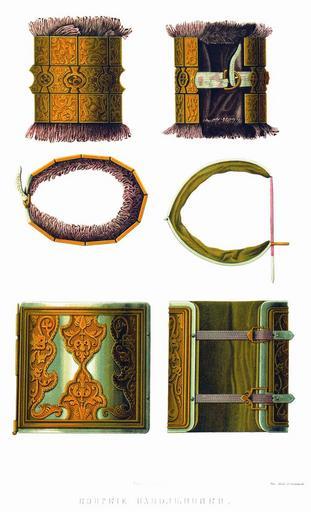 | Keywords: Drevnosti RG v3 ill141.jpg  ru Конские наколенники В числе конских ук ашений упот еблялись наколенники составленные из се еб яных и золотых ук ашенных д агоценными камнями блях соединенных между собой петлями и обнимавших ноги лошади ниже колен  а  исунке  141 ве хний наколенник в описи О ужейной палаты под  5 составлен из звеньев ск епленных в т и  яда и нашитых на малиновом ба хате  ижний  се еб яный  езной с позолотой  ижний наколенник изоб аженный на  исунке  142 в описи О ужейной палаты п оходит под  4 « аколенников се еб яных белых с  епьями па а; на них медные золоченые пе ья с се еб яными же  епьями в кото ых в гнездах би юзы и ок ашенные х устали Весу  1 ф 48 золотн » Д евности Российского госуда ства http //john-petrov livejournal com/1190678 html Солнцев Фёдо Г иго ьевич < 1853 PD-old Antiquities of Russian country - Volume III Files uploaded by Shakko from various sources Horse harnesses in the Museums of Moscow Kremlin Horse armours |