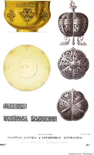 | Keywords: Drevnosti RG v5 ill 007.jpg ru Д евности Российского госуда ства Antiquities of Russian country 1846 1853 Иллюст ато ru Солнцев Фёдо Г иго ьевич Б атина поминальная Ца я и В К ихаила Феодо овича за упокой Ца евича Иоанна Иоанновича и се еб яная ку ильница адпись на б атине Б атина Госуда я Ца я и Великого Князя ихаила Федо овича всея Руси Самоде жца Зделана з золото че ново кото ая стоит на г обу Благове наго Ца евича Князя Ивана Ивановича 1846 1853 Руниве с ru Солнцев Фёдо Г иго ьевич other versions PD-old-70-1923 Files uploaded by Shakko from various sources Antiquities of Russian country - Volume V Uploaded with UploadWizard Bratina Ivan Ivanovich Michael I of Russia's items Donations of Russian rulers to Church Objects of Cathedral of the Archangel in Moscow |