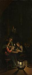 Keywords: Drieluik met allegorie op het kunstonderwijs Rijksmuseum SK-A-2320-B.jpeg nl Drieluik met een allegorie op het kunstonderwijs Op het middenpaneel een kraamkamer; een moeder geeft haar kind de borst Zij is gezeten aan een tafel de wieg en een mand voor haar op de vloer Van het plafond hangt een kroonluchter aan de muur de opgezette kop van een hert Op de achtergrond een tandarts De kraamkamer symboliseert de natuur Het linker zijpaneel toont een avondschool waar bij het licht van kaarsen en een lantaarn schrijven wordt geleerd De school symboliseert het onderwijs Op het rechter zijpaneel snijdt een geleerde in zijn werkkamer een pen bij het licht van de kaars De pennensnijder symboliseert oefening voor het middenstuk en rechter zijpaneel zie SK-A-2320-A/C drager Height cm 80 drager Width cm 36 exhibition history 2012-2013 Vrouw Maria and the St Michel Kotka Institution Rijksmuseum object history Acquisition 1908 object type painting PD-US PD-old-100 Data and photography rights All data and all images made available through the API are either in the public domain or are subject to a CC0 license https //www rijksmuseum nl/en/api/terms-and-conditions-of-use cc-zero place of creation http //www rijksmuseum nl/collectie/SK-A-2320-B Drieluik met allegorie op het kunstonderwijs Uploaded with GWToolset Drieluik met allegorie op het kunstonderwijs Rijksmuseum SK-A-2320-B http //www rijksmuseum nl/media/assets/SK-A-2320-B Images uploaded by Fæ Images from the Rijksmuseum Dutch 18th-century paintings in the Rijksmuseum Amsterdam Lanterns in art 1770 German paintings in the Rijksmuseum Amsterdam Willem Joseph Laquy |