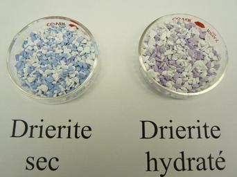 Keywords: Drierite indicateur.JPG fr Drierite avant et après adsorption d'humidité en Drierite - brand name and registered trademark - desiccant made from calcium sulfate gypsum - with color indicator own Brière2 2011-03-09 thumb left Cc-zero Desiccants Calcium sulfate |