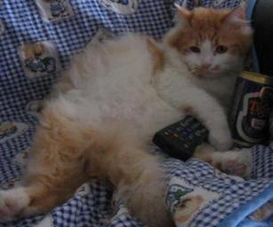 Keywords: Drunken trey.JPG My cat Trey Joshua Jay watching TV 2004-08-17 own assumed Whjayg Domestic cats Long-haired cats Red tabby and white cats