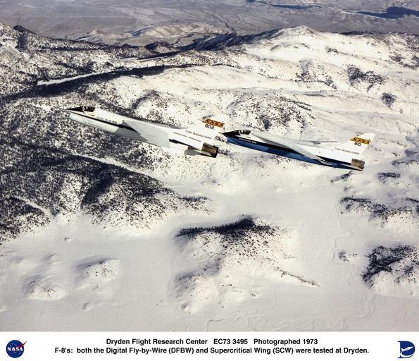 | Keywords: Dryden F-8 Research Aircraft Fleet 1973 in flight, DFBW and SCW DVIDS697267.jpg en F-8 Digital Fly-By-Wire left and F-8 Supercritical Wing in flight These two aircraft fundamentally changed the nature of aircraft design The F-8 DFBW pioneered digital flight controls and led to such computer-controlled airacrft as the F-117A X-29 and X-31 Airliners such as the Boeing 777 and Airbus A320 also use digital fly-by-wire systems The other aircraft is a highly modified F-8A fitted with a supercritical wing Dr Richard T Whitcomb of Langley Research Center originated the supercritical wing concept in the late 1960s Dr Whitcomb also developed the concept of the area rule in the early 1950s It singificantly reduced transonic drag The F-8 Digital Fly-By-Wire DFBW flight research project validated the principal concepts of all-electric flight control systems now used on nearly all modern high-performance aircraft and on military and civilian transports The first flight of the 13-year project was on May 25 1972 with research pilot Gary E Krier at the controls of a modified F-8C Crusader that served as the testbed for the fly-by-wire technologies The project was a joint effort between the NASA Flight Research Center Edwards California now the Dryden Flight Research Center and Langley Research Center It included a total of 211 flights The last flight was December 16 1985 with Dryden research pilot Ed Schneider at the controls The F-8 DFBW system was the forerunner of current fly-by-wire systems used in the space shuttles and on today's military and civil aircraft to make them safer more maneuverable and more efficient Electronic fly-by-wire systems replaced older hydraulic control systems freeing designers to design aircraft with reduced in-flight stability Fly-by-wire systems are safer because of their redundancies They are more maneuverable because computers can command more frequent adjustments than a human pilot can For airliners computerized control ensures a smoother ride than a human pilot alone can provide Digital-fly-by-wire is more efficient because it is lighter and takes up less space than the hydraulic systems it replaced This either reduces the fuel required to fly or increases the number of passengers or pounds of cargo the aircraft can carry Digital fly-by-wire is currently used in a variety of aircraft ranging from F/A-18 fighters to the Boeing 777 The DFBW research program is considered one of the most significant and most successful NASA aeronautical programs since the inception of the agency F-8 aircraft were built originally for the U S Navy by LTV Aerospace of Dallas Texas The aircraft had a wingspan of 35 feet 2 inches; was 54 feet 6 inches long; and was powered by a Pratt Whitney J57 turbojet engine The F-8 Supercritical Wing was a flight research project designed to test a new wing concept designed by Dr Richard Whitcomb chief of the Transonic Aerodynamics Branch Langley Research Center Hampton Virginia Compared to a conventional wing the supercritical wing SCW is flatter on the top and rounder on the bottom with a downward curve at the trailing edge The Supercritical Wing was designed to delay the formation of and reduce the shock wave over the wing just below and above the speed of sound transonic region of flight Delaying the shock wave at these speeds results in less drag Results of the NASA flight research at the Flight Research Center Edwards California later renamed the Dryden Flight Research Center demonstrated that aircraft using the supercritical wing concept would have increased cruising speed improved fuel efficiency and greater flight range than those using conventional wings As a result supercritical wings are now commonplace on virtually every modern subsonic commercial transport Results of the NASA project showed the SCW had increased the transonic efficiency of the F-8 as much as 15 percent and proved that passenger transports with supercritical wings versus conventional wings could save 78 million in 1974 dollars per year for a fleet of 280 200-passenger airliners The F-8 Supercritical Wing SCW project flew from 1970 to 1973 Dryden engineer John McTigue was the first SCW program manager and Tom McMurtry was the lead project pilot The first SCW flight took place on March 9 1971 The last flight of the Supercritical wing was on May 23 1973 with Ron Gerdes at the controls Original wingspan of the F-8 is 35 feet 2 inches while the wingspan with the supercritical wing was 43 feet 1 inch F-8 aircraft were powered by Pratt Whitney J57 turbojet engines The TF-8A Crusader was made available to the NASA Flight Research Center by the U S Navy F-8 jet aircraft were built originally by LTV Aerospace Dallas Texas Rockwell International's North American Aircraft Division received a 1 8 million contract to fabricate the supercritical wing which was delivered to NASA in December 1969 NASA Identifier NIX-EC73-3495 2009-09-23 Glenn Research Center https //www dvidshub net/image/697267 697267 2012-10-10 13 56 WASHINGTON DC US PD-USGov Langley Research Center Images from DoD uploaded by Fæ |