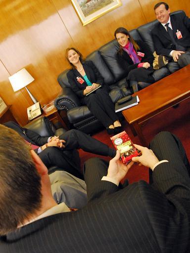 | Keywords: indoor Ambassador Nelson converses with Eisenhower Fellows Adrienne Kravitz, Carina Novarese and Daniel Pagliano. [U.S. Embassy photo by Pablo Castro] Ambassador Nelson converses with Eisenhower Fellows Adrienne Kravitz, Carina Novarese and Daniel Pagliano. [U.S. Embassy photo by Pablo Castro] |