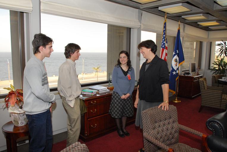 Keywords: mataojo video contest concurso faraldo fabini matthewman solis indoor Sebastián y Santiago Faraldo del Liceo Cuna de Fabini, Solís de Mataojo, acompañados por su profesora de Biología Carmen García son felicitados por la Encargada de Negocios de los Estados Unidos Robin Matthewman. Sebastián y Santiago son integrantes del grupo de estudiantes Solis Films, creativo del cortometraje ganador del concurso de video sobre el medio ambiente organizado por la embajada. [U.S. Embassy photo by Vince Alongi / Copyright info] Sebastián y Santiago Faraldo del Liceo Cuna de Fabini, Solís de Mataojo, acompañados por su profesora de Biología Carmen García son felicitados por la Encargada de Negocios de los Estados Unidos Robin Matthewman. Sebastián y Santiago son integrantes del grupo de estudiantes Solis Films, creativo del cortometraje ganador del concurso de video sobre el medio ambiente organizado por la embajada. [U.S. Embassy photo by Vince Alongi / Copyright info] |