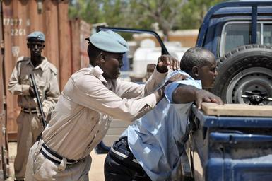 | Keywords: amisom au africa african union africanunion mogadishu police spf search somali police force somalipoliceforce somalia arrest capacity building capacitybuilding policing security training outdoor Somali police officers take part in a training excercise to stop and search a vehicle at General Kahiye Police Academy in Mogadishu, Somalia, on June 16. The African Union is currently training one hundred Somali Police officers in a program aimed at equipping the Somali Police Force with the necessary skills to effectively arrest suspects, stop vehicles at checkpoints, and cordon off areas. AMISOM Photo / Tobin Jones Somali police officers take part in a training excercise to stop and search a vehicle at General Kahiye Police Academy in Mogadishu, Somalia, on June 16. The African Union is currently training one hundred Somali Police officers in a program aimed at equipping the Somali Police Force with the necessary skills to effectively arrest suspects, stop vehicles at checkpoints, and cordon off areas. AMISOM Photo / Tobin Jones |