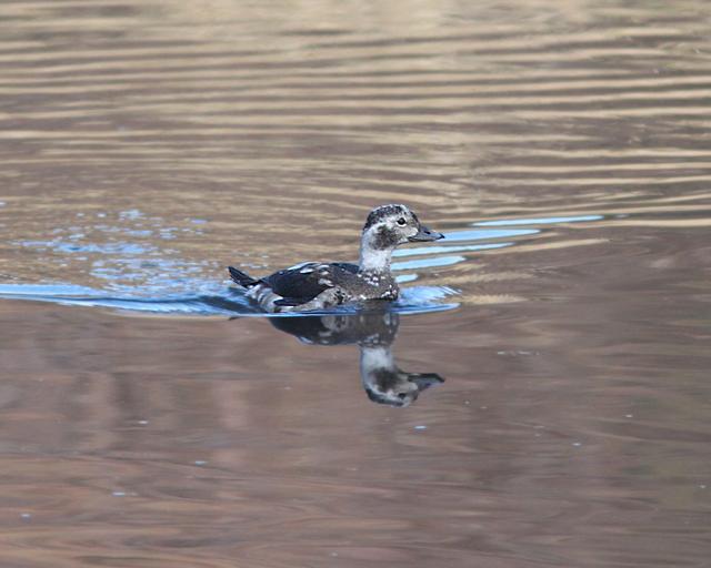 | Keywords: outdoor When first posted I had thought that this bird was an adult male. Doing more research, I now feel that it was a HY male in "supplemental 1" plumage or there-about. Primary reason being the amount of brown in the face and flanks and breast. I think that in an adult male in molt that the mix would be black and white, not brown and white. And although the bill of an adult male might be all gray at this time of year, I think that this is more likely of an imm bird. The following is copied from NA Birds: "Alternate I Plumage Prealternate I molt begins in Oct and continues to mid-Dec. Timing known only for male, assumed to be similar for female (Palmer 1976). Partial molt; Juvenal wing and Basic I tail and belly retained. Male. A less well-defined version of Definitive Alternate male plumage. Gray patch around eye more brown and less well defined, loral-patch dark brown (not black). Breast has smaller and less crisp black band than in Definitive Alternate. Back a mixture of black and white feathers; scapulars gray to white. Sides and flanks light gray, belly white." Robertson, Gregory J. and Jean-Pierre L. Savard. 2002. Long-tailed Duck (Clangula hyemalis), The Birds of North America Online (A. Poole, Ed.). Ithaca: Cornell Lab of Ornithology; Retrieved from the Birds of North America Online: bna.birds.cornell.edu/bna/species/651 doi:10.2173/bna.651 When first posted I had thought that this bird was an adult male. Doing more research, I now feel that it was a HY male in "supplemental 1" plumage or there-about. Primary reason being the amount of brown in the face and flanks and breast. I think that in an adult male in molt that the mix would be black and white, not brown and white. And although the bill of an adult male might be all gray at this time of year, I think that this is more likely of an imm bird. The following is copied from NA Birds: "Alternate I Plumage Prealternate I molt begins in Oct and continues to mid-Dec. Timing known only for male, assumed to be similar for female (Palmer 1976). Partial molt; Juvenal wing and Basic I tail and belly retained. Male. A less well-defined version of Definitive Alternate male plumage. Gray patch around eye more brown and less well defined, loral-patch dark brown (not black). Breast has smaller and less crisp black band than in Definitive Alternate. Back a mixture of black and white feathers; scapulars gray to white. Sides and flanks light gray, belly white." Robertson, Gregory J. and Jean-Pierre L. Savard. 2002. Long-tailed Duck (Clangula hyemalis), The Birds of North America Online (A. Poole, Ed.). Ithaca: Cornell Lab of Ornithology; Retrieved from the Birds of North America Online: bna.birds.cornell.edu/bna/species/651 doi:10.2173/bna.651 |