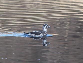Keywords: outdoor bird animal aquatic bird When first posted I had thought that this bird was an adult male. Doing more research, I now feel that it was a HY male in "supplemental 1" plumage or there-about. Primary reason being the amount of brown in the face and flanks and breast. I think that in an adult male in molt that the mix would be black and white, not brown and white. And although the bill of an adult male might be all gray at this time of year, I think that this is more likely of an imm bird. The following is copied from NA Birds: "Alternate I Plumage Prealternate I molt begins in Oct and continues to mid-Dec. Timing known only for male, assumed to be similar for female (Palmer 1976). Partial molt; Juvenal wing and Basic I tail and belly retained. Male. A less well-defined version of Definitive Alternate male plumage. Gray patch around eye more brown and less well defined, loral-patch dark brown (not black). Breast has smaller and less crisp black band than in Definitive Alternate. Back a mixture of black and white feathers; scapulars gray to white. Sides and flanks light gray, belly white." Robertson, Gregory J. and Jean-Pierre L. Savard. 2002. Long-tailed Duck (Clangula hyemalis), The Birds of North America Online (A. Poole, Ed.). Ithaca: Cornell Lab of Ornithology; Retrieved from the Birds of North America Online: bna.birds.cornell.edu/bna/species/651 doi:10.2173/bna.651 When first posted I had thought that this bird was an adult male. Doing more research, I now feel that it was a HY male in "supplemental 1" plumage or there-about. Primary reason being the amount of brown in the face and flanks and breast. I think that in an adult male in molt that the mix would be black and white, not brown and white. And although the bill of an adult male might be all gray at this time of year, I think that this is more likely of an imm bird. The following is copied from NA Birds: "Alternate I Plumage Prealternate I molt begins in Oct and continues to mid-Dec. Timing known only for male, assumed to be similar for female (Palmer 1976). Partial molt; Juvenal wing and Basic I tail and belly retained. Male. A less well-defined version of Definitive Alternate male plumage. Gray patch around eye more brown and less well defined, loral-patch dark brown (not black). Breast has smaller and less crisp black band than in Definitive Alternate. Back a mixture of black and white feathers; scapulars gray to white. Sides and flanks light gray, belly white." Robertson, Gregory J. and Jean-Pierre L. Savard. 2002. Long-tailed Duck (Clangula hyemalis), The Birds of North America Online (A. Poole, Ed.). Ithaca: Cornell Lab of Ornithology; Retrieved from the Birds of North America Online: bna.birds.cornell.edu/bna/species/651 doi:10.2173/bna.651