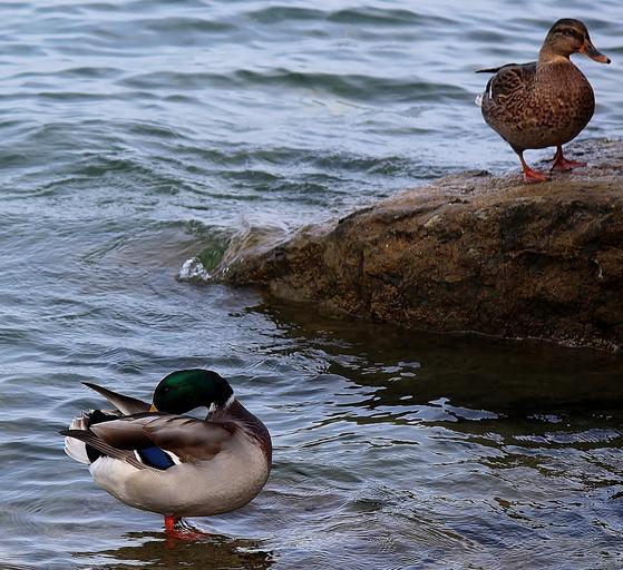Keywords: ducks pair of ducks couple stone water shallow lake lake constance