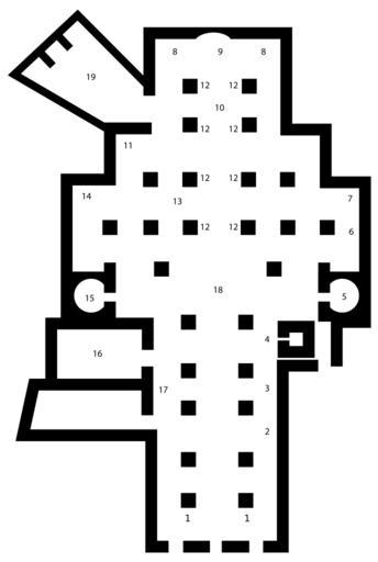 | Keywords: Duomo Siena interior.svg Plan of Siena Cathedral 1 Antonio Federighi Holy Water Stoups 2 Raffaello Vanni St Francis de Sales 3 Pier Dandini Saint Catherine 4 Bell Tower 5 Gian Luigi Bernini Madonna del Voto Chapel 6 Luigi Mussini Saint Crescentius 7 Alessandro Casolani Nativity 8 Wooden Choir 9 Duccio di Buoninsegna Stained Glass Window 10 Baldassare Peruzzi Main Altar 11 Donatello Bishop Pecci's Tomb 12 Domenico Beccafumi Angel Candelabra Holders 13 Nicola Pisano Pulpit 14 Francesco Vanni Saint Ansanus 15 Donatello St John the Baptist 16 Piccolomini Library 17 Andrea Bregno Piccolomini Altar 18 Pavement 19 Sacristy Pianta della cattedrale di Siena 1 Acquasantiere di Antonio Federighi 2 S Francesco di Sales di Raffaello Vanni 3 S Caterina di Pier Dandini 4 Torre campanaria 5 Cappella della Madonna del Voto di Bernini 6 San Crescenzio di Luigi Mussini 7 Natività di Alessandro Casolani 8 Coro ligneo 9 Vetrata di Duccio da Buoninsegna 10 Altare maggiore di Baldassare Peruzzi 11 Lastra tombale di Giovanni Pecci di Donatello 12 Angelo portacero di Domenico Beccafumi 13 Pulpito di Nicola Pisano 14 Sant'Ansano di Francesco Vanni 15 San Giovanni Battista di Donatello 16 Libreria Piccolomini 17 Altare Piccolomini di Andrea Bregno 18 Pavimento 19 Sagrestia <gallery>Image Duomo Siena interior Apr 2008 5 JPG</gallery> 2008 Gothika created with Adobe Illustrator Image may be used for any purpose Cathedral Siena - Plans SVG buildings |