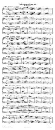 Keywords: Dur-Tonleitern+Fingersatz.gif de Die gebräuchlichsten Dur-Tonleitern über 3 Oktaven mit Fingersatz 2015-03-27 own Manuela other versions Uploaded with UploadWizard Images with LilyPond source code Sheet music for piano Major musical scales LilyPond source <source lang latex > \version 2 18 2 set paper-alist cons ' mein Format cons 10 in 23 5 in paper-alist \layout indent '0 line-width 200 ragged-last f \context \Staff \omit ClefModifier \override TimeSignature 'break-visibility end-of-line-invisible \override Clef 'break-visibility begin-of-line-visible \context \Score \remove Bar_number_engraver \override Score BarNumber break-visibility ' f f f \header title Tonleitern mit Fingersatz composer subtitle über 3 Oktaven tagline \language deutsch FootLeft string-append Dur-Tonleitern über 3 Oktaven FootRight string-append mit Fingersatz FootCenter string-append gesetzt mit Lilypond 2 18 \paper set-paper-size mein Format top-margin 1 5\cm horizontal-shift -3 5 \mm oddFooterMarkup \markup \fill-line \abs-fontsize 9 5 \FootLeft \abs-fontsize 7 0 \italic \FootCenter \abs-fontsize 9 5 \FootRight NotenObenC \repeat volta 2 \ottava -1 c4-1 d8-2 e-3 \ottava 0 f-1 g-2 a-3 h-4 c4-1 d8-2 e-3 f-1 g-2 a-3 h-4 c4-1 d8-2 e-3 f-1 g-2 a-3 h-4 c4-5 h8-4 a-3 g-2 f-1 e-3 d-2 c4-1 h8-4 a-3 g-2 f-1 e-3 d-2 c4-1 h8-4 a-3 \ottava -1 g-2 f-1 e-3 d-2 c1-1 \bar NotenUntenC c4-5 d8-4 e-3 f-2 g-1 a-3 h-2 c4-1 d8-4 e-3 f-2 g-1 a-3 h-2 c4-1 d8-4 e-3 \ottava 1 f-2 g-1 a-3 h-2 c4-1 h8-2 a-3 g-1 f-2 e-3 d-4 \ottava 0 c4-1 h8-2 a-3 g-1 f-2 e-3 d-4 c4-1 h8-2 a-3 g-1 f-2 e-3 d-4 c1-5 unten \relative c \clef bass \key c \major \time 4/4 \NotenUntenC NotenObenFis \repeat volta 2 \ottava -1 c4-2 d8-3 e-4 \ottava 0 f-1 g-2 a-3 h-1 c4-2 d8-3 e-4 f-1 g-2 a-3 h-1 c4-2 d8-3 e-4 f-1 g-2 a-3 h-1 c4-2 h8-1 a-3 g-2 f-1 e-4 d-3 c4-2 h8-1 a-3 g-2 f-1 e-4 d-3 c4-1 h8-4 a-3 \ottava -1 g-2 f-1 e-4 d-3 c1-2 \bar NotenUntenFis c4-4 d8-3 e-2 f-1 g-3 a-2 h-1 c4-4 d8-3 e-2 f-1 g-3 a-2 h-1 c4-4 d8-3 e-2 \ottava 1 f-1 g-3 a-2 h-1 c4-2 h8-1 a-2 g-3 f-1 e-2 d-3 \ottava 0 c4-4 h8-1 a-2 g-3 f-1 e-2 d-3 c4-1 h8-1 a-2 g-3 f-1 e-2 d-3 c1-4 untenFis \relative c \clef bass \key c \major \time 4/4 \NotenUntenFis NotenObenB \repeat volta 2 \ottava -1 c4-2 d8-1 e-2 \ottava 0 f-3 g-1 a-2 h-3 c4-4 d8-1 e-2 f-3 g-1 a-2 h-3 c4-4 d8-1 e-2 f-3 g-1 a-2 h-3 c4-4 h8-3 a-2 g-1 f-3 e-2 d-1 c4-4 h8-3 a-2 g-1 f-3 e-2 d-1 c4-4 h8-3 a-2 \ottava -1 g-1 f-3 e-2 d-1 c1-2 \bar NotenUntenB c4-3 d8-2 e-1 f-4 g-3 a-2 h-1 c4-3 d8-2 e-1 f-4 g-3 a-2 h-1 c4-3 d8-2 e-1 \ottava 1 f-4 g-3 a-2 h-1 c4-3_2 h8-1 a-2 g-3 f-4 e-1 d-2 \ottava 0 c4-3 h8-1 a-2 g-3 f-4 e-1 d-2 c4-3 h8-1 a-2 g-3 f-4 e-1 d-2 c1-3 untenB \relative c \clef bass \key c \major \time 4/4 \NotenUntenB NotenObenEs \repeat volta 2 \ottava -1 c4-2 d8-1 e-2 \ottava 0 f-3 g-4 a-1 h-2 c4-3 d8-1 e-2 f-3 g-4 a-1 h-2 c4-3 d8-1 e-2 f-3 g-4 a-1 h-2 c4-3 h8-2 a-1 g-4 f-3 e-2 d-1 c4-3 h8-2 a-1 g-4 f-3 e-2 d-1 c4-3 h8-2 a-1 \ottava -1 g-4 f-3 e-2 d-1 c1-2 \bar NotenUntenEs c4-3 d8-2 e-1 f-4 g-3 a-2 h-1 c4-3 d8-2 e-1 f-4 g-3 a-2 h-1 c4-3 d8-2 e-1 \ottava 1 f-4 g-3 a-2 h-1 \noBreak c4-2 h8-1 a-2 g-3 f-4 e-1 d-2 \ottava 0 c4-3 h8-1 a-2 g-3 f-4 e-1 d-2 c4-3 h8-1 a-2 g-3 f-4 e-1 d-2 c1-3 untenEs \relative c \clef bass \key c \major \time 4/4 \NotenUntenEs NotenObenF \repeat volta 2 \ottava -1 c4-1 d8-2 e-3 \ottava 0 f-4 g-1 a-2 h-3 c4-1 d8-2 e-3 f-4 g-1 a-2 h-3 c4-1 d8-2 e-3 f-4 g-1 a-2 h-3 c4-4 h8-3 a-2 g-1 f-4 e-3 d-2 c4-1 h8-3 a-2 g-1 f-4 e-3 d-2 c4-1 h8-3 a-2 \ottava -1 g-1 f-4 e-3 d-2 c1-1 \bar NotenObenAs \repeat volta 2 \ottava -1 c4-3_2 d8-4_3 e-1 \ottava 0 f-2 g-3 a-1 h-2 c4-3 d8-4 e-1 f-2 g-3 a-1 h-2 c4-3 d8-4 e-1 f-2 g-3 a-1 h-2 c4-3 h8-2 a-1 g-3 f-2 e-1 d-4 c4-3 h8-2 a-1 g-3 f-2 e-1 d-4 c4-3 h8-2 a-1 \ottava -1 g-3 f-2 e-1 d-4_3 c1-3_2 \bar NotenObenDes \repeat volta 2 \ottava -1 c4-2 d8-3 e-1 \ottava 0 f-2 g-3 a-4 h-1 c4-2 d8-3 e-1 f-2 g-3 a-4 h-1 c4-2 d8-3 e-1 f-2 g-3 a-4 h-1 c4-2 h8-1 a-4 g-3 f-2 e-1 d-3 c4-2 h8-1 a-4 g-3 f-2 e-1 d-3 c4-2 h8-1 a-4 \ottava -1 g-3 f-2 e-1 d-3 c1-2 \bar \score \transpose c d \new PianoStaff << \set PianoStaff instrumentName \new Staff RH \relative c \clef treble \key c \major \time 4/4 \once \override Score RehearsalMark self-alignment-X LEFT \mark \markup \bold C-Dur _ \italic Ut majeur _ C major \NotenObenC \new Staff LH \unten >> \score \transpose c g \new PianoStaff << \set PianoStaff instrumentName \new Staff RH \relative c \clef treble \key c \major \time 4/4 \once \override Score RehearsalMark self-alignment-X LEFT \mark \markup \bold G-Dur _ \italic Sol majeur _ G major \NotenObenC \new Staff LH \unten >> \score \transpose c d \new PianoStaff << \set PianoStaff instrumentName \new Staff RH \relative c \clef treble \key c \major \time 4/4 \once \override Score RehearsalMark self-alignment-X LEFT \mark \markup \bold D-Dur _ \italic Ré majeur _ D major \NotenObenC \new Staff LH \unten >> \score \transpose c a \new PianoStaff << \set PianoStaff instrumentName \new Staff RH \relative c \clef treble \key c \major \time 4/4 \once \override Score RehearsalMark self-alignment-X LEFT \mark \markup \bold A-Dur _ \italic La majeur _ A major \NotenObenC \new Staff LH \unten >> \score \transpose c e \new PianoStaff << \set PianoStaff instrumentName \new Staff RH \relative c \clef treble \key c \major \time 4/4 \once \override Score RehearsalMark self-alignment-X LEFT \mark \markup \bold E-Dur _ \italic Mi majeur _ E major \NotenObenC \new Staff LH \unten >> \score \transpose c h \new PianoStaff << \set PianoStaff instrumentName \new Staff RH \relative c \clef treble \key c \major \time 4/4 \once \override Score RehearsalMark self-alignment-X LEFT \mark \markup \bold H-Dur _ \italic Si majeur _ H major \NotenObenC \new Staff LH \unten >> \score \transpose c fis \new PianoStaff << \set PianoStaff instrumentName \new Staff RH \relative c \clef treble \key c \major \time 4/4 \once \override Score RehearsalMark self-alignment-X LEFT \mark \markup \bold Fis-Dur _ \italic Fa \sharp majeur _ F \sh