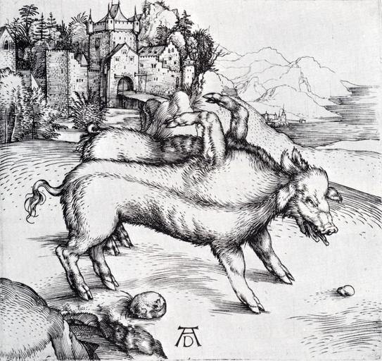 Keywords: Dürer, Albrecht — The Monstrous Sow of Landser — circa 1496.jpg eight-footed four-eared two-tongued title Wunderbare Sau von Landser The Monstrous Sow of Landser <br> alternate title de Die missgebildete Sau von Landser Monstrous Pig of Landser http //www sightswithin com/Albrecht Durer/The_Monstrous_Sow_of_Landser jpg 1496 12 1 x 12 7 cm engraving watermark High Crown with thread margins object history Provenance G L Bradley Collection Washington Lugt 288b Bartsch 95; Meder Hollstein 82 Sold on 19 April 2011 by Christie's London for £3 125 00 Sale 5451 <sup>http //www christies com/lotfinder/prints-multiples/albrecht-durer-the-monstrous-sow-of-landser-5428028-details aspx lot-overview</sup> Creator Albrecht Dürer PD-old-100 Engravings by Albrecht Dürer 1494-1499 castles in art 1496 works Boars in art Engravings of animals animals facing right in art Two-headed animals in art Congenital diseases and disorders of animals Landser landscapes of France in art Location of museum or gallery missing Uploads by Mattes from external sources |