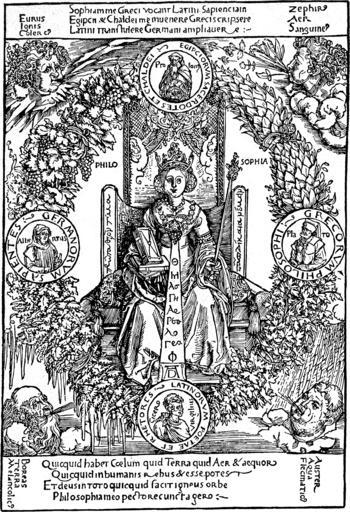 | Keywords: Dürer, Philosophia.png  Boëthius ™ Consolation of Philosophy Four famous wise men Plato Ptolemy Cicero or Virgil Albertus Magnus represent Greek philosophers Egyptian priests Roman poets and orators German wise men In the corners the four personificated winds stay for the four cardinal points elements and temperaments associated with them Boëthius ™ Trost der Philosophie Vier berühmte Weise Platon Ptolemaios Cicero oder Vergil Albertus Magnus stehen für žGriechische Philosophen žÃ„gyptische Priester žRömische Dichter und Redner žDeutsche Weise In den Ecken stehen die vier personifizierten Winde für die mit ihnen assoziierten vier Himmelsrichtungen Elemente und Temperamente Scanned from Albrecht Dürer 1471 bis 1528 Das gesamte graphische Werk mit einer Einleitung von Wolfgang Hütt Band 2 Druckgraphik München Rogner und Bernhard 1971 page 1437 Creator Albrecht Dürer 1502 PD-old-100 Woodcuts by Albrecht Dürer 1501-1510 Allegories of philosophy Consolation of Philosophy Plato Ptolemy Virgil Cicero Albertus Magnus 1502 works in Germany |