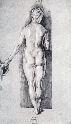 View Original:durer_rear_view_female_nude_holding_cap_1506.jpg (578x1000)