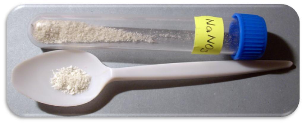 Keywords: Dusičnan sodný.PNG Dusičnan sodný - NaNO3 own 2007-06-24 Ondřej Mangl Není nutno Sodium nitrate Samples of chemical compounds
