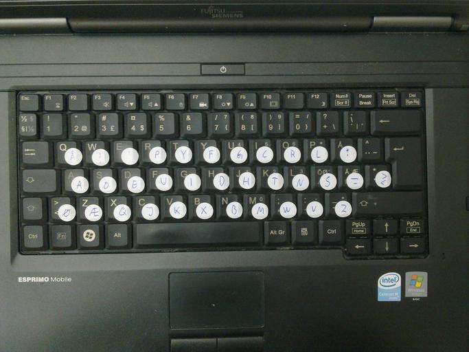 Keywords: Dvorak hybrid.jpg no Her ses et hybridtastatur der det både er bokstaver for Dvorak og Qwerty Tastene for Qwerty er originale mens Dvorak-tastene er manuelt påskrevet og påklistret Hand-made Dvorak labels pasted over the keys of a non-Dvorak computer keyboard 2011-11-07 own Oddiss1985 cc-zero Uploaded with UploadWizard Dvorak keyboard layouts |