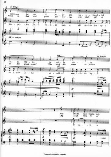| Keywords: Dvorak's Biblicke Pisne i-16.jpg Dvorak's_Biblicke_Pisne_i- jpg 15 17 Antonín Dvořák's Biblícké Písně Biblical Songs Op 99 1884 Book 1 containing Songs 1-5 While Dvorak later orchestrated the work this the complete original piano-and-voice version While the massacre of the original music to fit the German and English is appalling it does contain the original Czech and the original music for the Czech The German and English should probably be considered only as a translation This is the first five songs out of ten the other five are printed in a second volume I have not yet tracked down I haven't been able to find Book 2 unfortunately 1895 copy in my own possession The only copyright claimed on the sheet music itself is to N Simrock which is a publishing house Antonín Dvořák 1841 1904 PD-Old Original Czech From http //music ibiblio org/pub/multimedia/pandora/vorbis/contrib/Marta_Chaloupka_Live/Czech notes accompanying the Pandora Music recording 1 Psalm 97 2-6 Oblak a mrákota jest vůkol Něho spravedlnost a soud základ trůnu Jeho Oheň předchází jej a zapaluje vůkol nepřátele Jeho Zasvěcujíť se po okršlku světa blýskání Jeho; to vidouc země děsí se Hory jako vosk rozplývají se před obličejem Hospodina panovníka vší země a slávu jeho spatřují všichni národové 2 Psalms 119 114-117 119 120 Skrýše má a pavéza má Ty jsi na slovo Tvé očekávám Odstuptež ode mne nešlechetníci abych ostříhal přikázaní Boha svého Posiluj mne bych zachován byl a patřil k ustanovením Tvým ustavičně Děsí se strachem před Tebou tělo mé; nebo soudů Tvých bojím se náramně 3 Psams 55 1 2 4/5 6 7 8 Slyš ó Bože Slyš modlitbu mou a neskrývej se před prosbou mou Pozoruj a vyslyš mne neboť naříkám v úpění svém a kormoutím se Srdce mé tesklí ve mně a strachové smrti přišli na mne a hrůza přikvačila mne I řekl jsem Ó bych měl křídla jako holubice zaletěl bych a poodpočinul Aj daleko bych se vzdálil a přebýval bych na poušti Pospíšil bych ujíti větru prudkému a vichřici 4 Psalms 23 1-4 Hospodin jest můj pastýř nebudu míti nedostatku Na pastvách zelených pase mne k vodám tichým mne přivodí Duši mou občerstvuje vodí mne po stezkách spravedlnosti pro jméno své Byť mi se dostalo jíti přes údolí stínu smrti nebuduť se báti zlého nebo Ty se mnou jsi; a prut Tvůj a hůl Tvá toť mne potěšuje 5 Psalms 144 9 145 1-3 5 6 Bože Bože píseň novou zpívati budu Tobě na loutně a žalmy tobě prozpěvovati Na každý den dobrořečiti budu Tobě a chváliti jméno Tvé na věky věků Hospodin jistě veliký jest a vší chvály hodný a velikost jeho nemůž vystižena býti O slávě a kráse a velebnosti Tvé i o věcech Tvých předivných mluviti budu A moc přehrozných skutků Tvých vsichni rozhlašovati budou; i já důstojnost Tvou budu vypravovati 6 Psalms 61 1 3 4 63 1 4/5 Slyš ó Bože volání mé pozoruj modlitby mé Nebo jsi býval útočiště mé a pevná věže před tváří nepřítele Buduť bydliti v stánku tvém na věky schráním se v skrýši křídel tvých Bože Bůh silný můj ty jsi tebeť hned v jitře hledám Tebe žízní duše má po tobě touží tělo mé v zemi žíznivé a vyprahlé v níž není vody A tak abych tobě dobrořečil a s radostným rtů prozpěvováním chválila by tě ústa má 7 Psalms 137 1-5 Při řekách Babylonských tam jsme sedávali a plakávali rozpomínajíce se na Sion Na vrbí v té zemi zavěšovali jsme citary své když se tam dotazovali nás ti kteříž nás zajali na slova písničky říkajíce Zpívejte nám některou píseň Sionskou Odpovídali jsme Kterakž bychom mohli zpívati píseň Hospodinovu v zemi cizozemců Jestliže se zapomenu na tebe ó Jeruzaléme ó zapomeniž i pravice má umění svého 8 Psalms 25 16-18 20 Popatřiž na mne a smiluj se nade mnou neboť jsem opuštěný a strápený Soužení srdce mého rozmnožují se z úzkostí mých vyveď mne z úzkostí mých vyveď mne Smiluj se nade mnou Viz trápení mé a bídu mou a odpusť všecky hříchy mé Ostříhej duše mé a vytrhni mne ať nejsem zahanben neboť v tebe doufám neboť v tebe doufám 9 Psalms 121 1-4 Pozdvihuji očí svých k horám odkud by mi přišla pomoc Pomoc má jest od Hospodina kterýž učinil nebe i zemi Nedopustíť aby se pohnouti měla noha tvá nebo nedřímeť strážný tvůj Aj nedřímeť ovšem nespí ten kterýž ostříhá Izraele 10 Psalms 98 1 4/5 7 8 96 12/11 Zpívejte Hospodinu píseň novou neboť jest divné věci učinil Zvuk vydejte prozpěvujte a žalmy zpívejte Zvuč moře i to což v něm jest okršlek světa i ti což na něm bydlí Řeky rukama plésejte spolu s nimi i hory prozpěvujte Plésej pole a vše což na něm plésej země zvuč i moře i což v něm jest Biblické písně Psalm 144 |