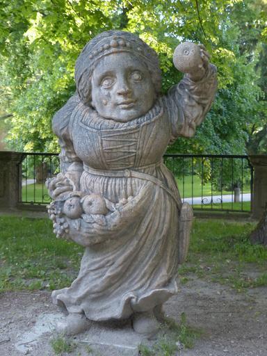 Keywords: dwarf gnome fig sculpture globe zwergelgarten mirabell gardens baroque salzburg stone statue stone stone figure dwarf woman fruit