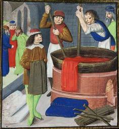 Keywords: Dyeing British Library Royal MS 15.E.iii, f. 269 1482.jpg Dyeing wool cloth from Des Proprietez des Choses by Bartholomaeus Anglicus British Library Royal MS 15 E iii folio 269 http //www nationalarchives gov uk/utk/england/popup/wool htm 1482 author PD-old-100 Dyers in art Des Proprietez des Choses Volume II 1482 - BL Royal MS 15 E III Wool |