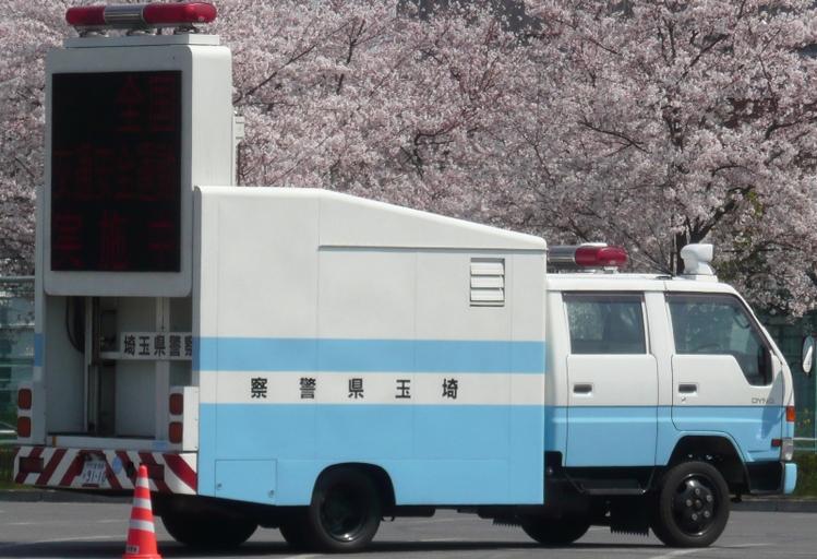 Keywords: Dyna-signcar.jpg 埼玉 警のサインカー own Photo by me 2009-04-06 Ypy31 Toyota Dyna 6th generation Police automobiles in Japan Blue and white police vehicles Mobile road signs with lights Road signs in Japan Saitama Prefectural Police Japanese writing from right to left Signs on vehicles in Japan Displays in Japan Red and white stripe traffic cones in Japan Blue and white stripes Striped land vehicles