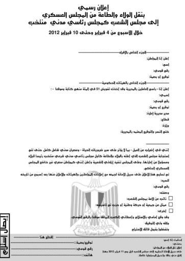 | Keywords: E3lan11feb2012.jpg ar إعلان رسمي بنقل الولاء والطاعة من المجلس العسكري لمجلس الشعب المصري كمجلس رئاسي منتخب خلال الأسبوع من 4 فبراير وحتى 10 فبراير 2012 2012-02-04 own Opensourceit السلام عليكم جميعا أيها الأساتذة والزملاء الأفاضل، كما ترون، فقد سرت الدعوة للإضراب والعصيان المدني في مصر منذ أيام أرجو قراءة الاقتراح المرفق فورا، ودراسته سريعا اليوم، واتخاذ القرار بشأنه في أسرع وقت، إن رأيتم جدواه شكرا جزيلا لينجح الإضراب أعلن تسليم ولائك لمجلس الشعب كمدلس رئاسي مدني حتى يكون الإضراب/العصيان المدني الشعبي في مصر لتسليم السلطة حلا كاملا للأزمة لابد معه من إعلان تسليم ولاء لسلطة مدنية بديلة إعلان ولاء من كل وزارة أو قطاعات وراء قطاعات داخل جميع الوزارات بمديرياتها بما فيها وزارة الدفاع والداخلية وجميع مرافق البلاد بهذا تكون البلد كلها سلمت السلطة لجهة مدنية منتخبة شرعية بديلة وهي مجلس الشعب باعتباره المجلس الرئاسي المدني الشرعي المنتخب وعدم طاعة أي أوامر تصدر من المجلس العسكري إلا بعد مصادقتها من مجلس الشعب باعتباره المجس الرئاسي المدني الشرعي الوحيد هذا نموذج إعلان ولاء توقيع للهيئات الحكومية والوزارات بمكان لختم النسر ومكان إمضاء مدير المديرية، ومعه في نفس الورقة نموذج لأفراد المواطنين برقم البطاقة والهاتف والتوقيع أو البصمة لكل مواطن، ويتم تسليمها إلى أعضاء مجلس الشعب - أو لفروع الجمعية الوطنية للتغيير أو حركة 6 أبريل أو غيرها من الحركات والمنظمات الوطنية الموثوق في أمانتها والتي قادت الدعوة لهذه الثورة، وفروعها في المحافظات على سبيل الأمانة ويظل كعب التسليم مع المواطن أو رئيس الهيئة، وذلك من اليوم وحتى 10 فبراير حين يقوم مجلس الشعب بحصر الاستمارات - بعد أن تكون كل جهة شعبية حصرت الوارد إليها على حدة - وإعلان استلام السلطة من الشعب في يوم 11 فبراير ابدأ الان فأمام مصر ستة أيام فقط للانتهاء من تجميع الإعلان الشعبي الكامل لنقل السلطة دورك كفرد طبع ونشر وتوزيع الإعلان بكل حماس لكل الناس حولك بالايميل والمحمول والبلوتوث وفي الصحف والشارع دورك كنائب برلمان أو حركة أو حزب أو منظمة إصدار بيان فوري الآن بتبني الإعلان وتحمل مسؤولية توزيع واستلام وجمع الإعلانات من المواطنين، لتسليمها لمجلس الشعب الشرعي يوم 10 فبراير نص الإعلان ____________________________ إعلان رسمي بنقل الولاء والطاعة من المجلس العسكري لمجلس الشعب كمجلس رئاسي منتخب خلال الأسبوع من 4 فبراير وحتى 10 فبراير 2012 ----------------------الجزء الخاص بالأفراد--------------------------------------- أعلن أنا المواطن اسم رقم قومي توقيع أو بصمة ----------------------الجزء الخاص بالهيئات الحكومية---------------------- أعلن أنا - باسم العاملين بالمديرية وقد أخذت تفويض 51 في المئة منهم كتابة وموقعا - اسمي رقم قومي توقيع أو بصمة مدير مديرية/إدارة قطاع وزارة ختم النسر والتوقيع المعتمد بالمديرية ---------------------- أنني في إضراب عن العمل - بما لا يؤثر على سير ضروريات الحياة بمصر - وعصيان مدني شامل كامل، حتى تتم استجابة مجلس الشعب الذي أعلنه بالولاء والطاعة كأول مجلس رئاسي مدني شرعي منتخب رئيسا للبلاد ومسؤولا عن إدارتها، واستجابة كافة الوزارات بما فيها وزارة الدفاع والقوات المسلحة وعلى المجلس تنفيذ إرادتي الشعبية وأعلن أنني كمواطن مصري غير خاضع للمجلس العسكري الحاكم تم تسليم هذا الإعلان - على سبيل الأمانة لجمعه مع إعلانات المواطنين والهيئات والإعلان عنها بعد أسبوع من تاريخه - للسيد رقم قومي وصفته نائب عن الأمة بمجلس الشعب ممثل عن جمعية أو حركة وطنية أو حزب تم تاسيسه أخرى اذكرها وقد وقع أمامي بالاستلام وأعطاني الكعب المرفق موقعا برقمه القومي وهاتفه والله ولي التوفيق وتفضلوا بقبول فائق الاحترام إيصال استلام استلمت أنا اسم بصفتي إعلان نقل الولاء من المواطن على سبيل الأمانة لتسليمه إلى مجلس الشعب قبل يوم 11 فبراير 2012 وهذا إقرار مني بذلك وأتحمل المسؤولية كاملة توقيع/بصمة ----------------------------------------