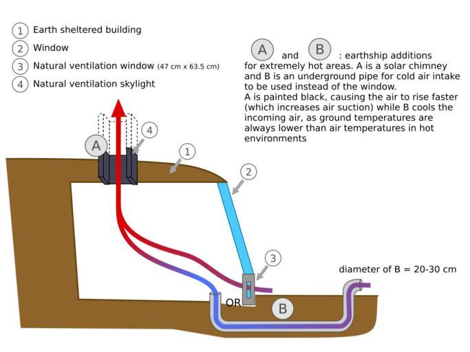 | Keywords: Earthship-ventilation-cooling-tube-schematic.svg en A picture of the workings of natural ventilation in a earthship earthship design for arid subtropical climate; uses windows tilted at 60° Schematic was based on a picture found in the book Earthship Vol 2 Systems and Components by Michael Reynolds EarthshipVentilation_new png 2013-04-27 23 30 UTC derivative work Anasofiapaixao EarthshipVentilation_new png Tirkfl EarthshipVentilation_new png Vectored slight rewording of the image text different look for the airflux arrow Anasofiapaixao EarthshipVentilation_new png Anasofiapaixao Anasofiapaixao exp h Sustainable architecture Earthship Natural indoor ventilation |