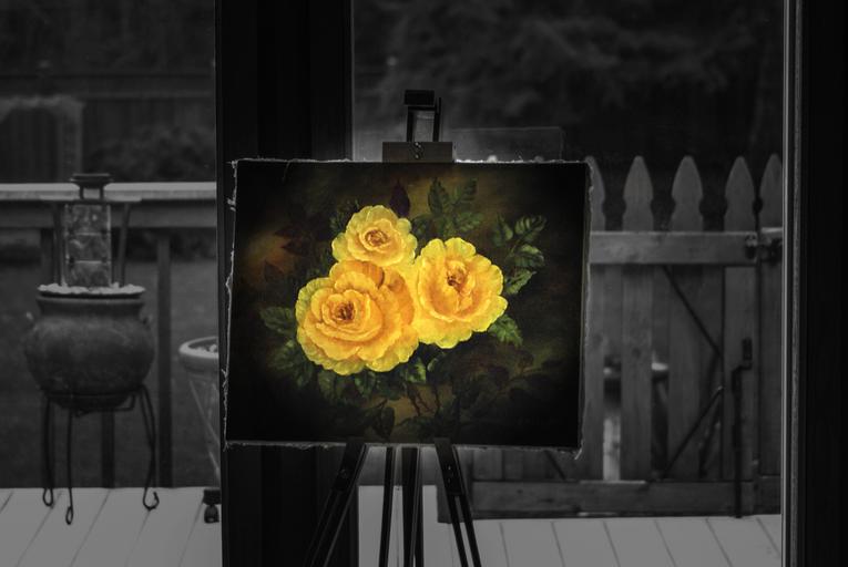 Keywords: easel painting rose art black and white yellow decorative flowers