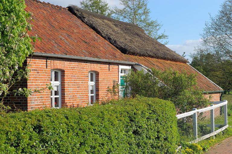 Keywords: east frisia fehnhaus old old fehnhaus historic preservation door rear gable thatched cover sky museum garden hedge original building