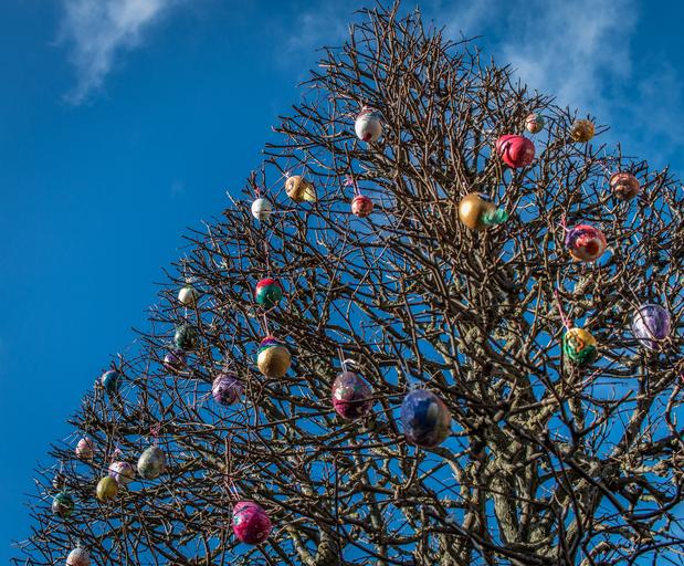 Keywords: easter eggs tree blue sky brown outdoor