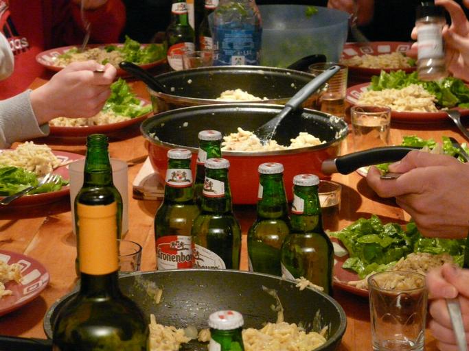 Keywords: eat food celebration table kässpätzle cheese noodles beer pan pot plate hunger