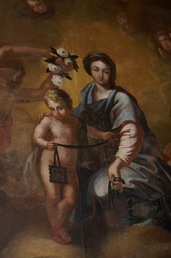 Keywords: Ebersmunster Abbatiale115.jpg fr Alsace Bas-Rhin Ebersmunster Eglise abbatiale Saint-Maurice Tableau Vierge à l'Enfant dite Notre-Dame du scapulaire XVIIIe own Rh-67 2011 cc-by-sa-3 0 Artwork / Œuvre d'art / Kunstwerk Artist Vierge avec l'Enfant Jésus portant chacun un scapulaire entouré d'anges et d'angelots XVIIIe siècle oil canvas cm 345 180 Abbatiale Saint-Maurice Ebersmunster PM67000057 IM67007568 object history tableau classé y compris le cadre other versions Ralph Hammann PD-old accession number Photographs of Ebersmunster by Ralph Hammann Taken with Konica Minolta Dynax 5D Interior of Abbey Church Ebersmunster Objets monuments historiques in Ebersmunster Objets monuments historiques in Bas-Rhin church paintings Paintings of Madonna and Child in France Baroque church paintings in Alsace Our Lady of the Scapular 18th-century church paintings in Alsace Details of 18th-century paintings