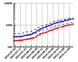 | Keywords: Ebola guinea2014 log.svg  de Logscale-Version von File Ebola guinea2014 svg 2014-10-18 11 50 20 own StefanPohl other versions cc-zero v gnuplot 5 1 CVS reset set terminal svg size 600 480 fname 'Verdana sans-serif bold' fsize 18 lw 5 unset key set grid lt 1 lc rgb 0xAAAAAA lw 5 set border 3 lw 75 set tics nomirror set xdata time set timefmt ' Y- m- d' set format x ' Y- m- d' set autoscale fix set xtics 60 60 24 14 nomirror rotate by 45 right set for i 1 4 style line i ps 75 pt 7 set style line 1 lc rgb 0x0000FF dt 2 set style line 2 lc rgb 0x0000FF set style line 3 lc rgb 0xFF0000 dt 2 set style line 4 lc rgb 0xFF0000 NA ' ' do fordata in 'ebola_guinea2014 ebola_liberia2014 ebola_sierraleone2014' set output data ' svg' set yrange 0 plot data ' txt' \ u 1 strcol 2 eq NA strcol 3 eq NA strcol 4 eq NA 8 2+ 3+ 4 ls 1 w lines \ u 1 2 ls 2 w linespoints \ u 1 strcol 5 eq NA strcol 6 eq NA strcol 7 eq NA 9 5+ 6+ 7 ls 3 w lines \ u 1 5 ls 4 w linespoints set output data '_log svg' unset yrange set logscale y replot unset logscale y Uploaded with UploadWizard 2014 Ebola outbreak statistics |