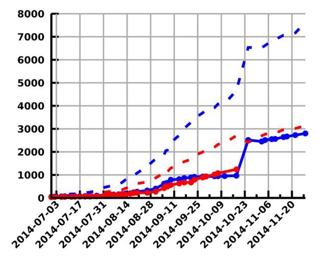 | Keywords: Ebola liberia2014.svg  de Ebola in Liberia 2014 Blau Bestätige Fälle gestrichelt inkl vermutete Fälle Rot davon Todesfälle gestrichelt inkl vermutete Fälle en Ebola virus disease in Liberia 2014 blue confirmed cases broken line including probable and suspect cases red confirmed deaths broken line including probable and suspect deaths 2014-07-11 10 01 55 own Data http //www who int/csr/don/archive/disease/ebola/en/ http //www who int/csr/disease/ebola/situation-reports/archive/en/ StefanPohl cc-zero v gnuplot 5 1 CVS reset set terminal svg size 600 480 fname 'Verdana sans-serif bold' fsize 18 lw 5 unset key set grid lt 1 lc rgb 0xAAAAAA lw 5 set border 3 lw 75 set tics nomirror set xdata time set timefmt ' Y- m- d' set format x ' Y- m- d' set autoscale fix set xtics 60 60 24 14 nomirror rotate by 45 right set for i 1 4 style line i ps 75 pt 7 set style line 1 lc rgb 0x0000FF dt 2 set style line 2 lc rgb 0x0000FF set style line 3 lc rgb 0xFF0000 dt 2 set style line 4 lc rgb 0xFF0000 NA ' ' do fordata in 'ebola_guinea2014 ebola_liberia2014 ebola_sierraleone2014' set output data ' svg' set yrange 0 plot data ' txt' \ u 1 strcol 2 eq NA strcol 3 eq NA strcol 4 eq NA 8 2+ 3+ 4 ls 1 w lines \ u 1 2 ls 2 w linespoints \ u 1 strcol 5 eq NA strcol 6 eq NA strcol 7 eq NA 9 5+ 6+ 7 ls 3 w lines \ u 1 5 ls 4 w linespoints set output data '_log svg' unset yrange set logscale y replot unset logscale y Grafikwerkstatt Uploaded with UploadWizard 2014 Ebola outbreak statistics |