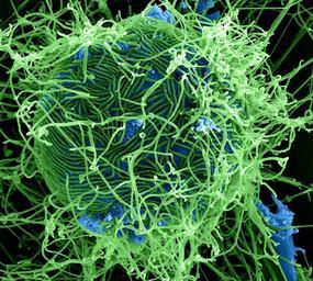 | Keywords: nih ebola virus niaid ebola virus ebolavirus electron micrograph electronmicrograph ebola virus particles ebolavirusparticles vero e6 cell veroe6cell national institutes of health nationalinstitutesofhealth nih image gallery nihimagegallery Colorized scanning electron micrograph of filamentous Ebola virus particles (green) attached to and budding from a chronically infected VERO E6 cell (blue) (25,000x magnification). Credit: National Institute of Allergy and Infectious Diseases, National Institutes of Health Colorized scanning electron micrograph of filamentous Ebola virus particles (green) attached to and budding from a chronically infected VERO E6 cell (blue) (25,000x magnification). Credit: National Institute of Allergy and Infectious Diseases, National Institutes of Health |