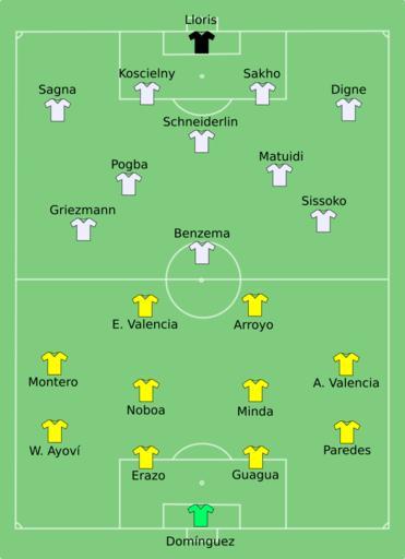 Keywords: ECU-FRA 2014-06-25.svg 2014 FIFA World Cup Group E match between Ecuador and France Groupe F de la Coupe du Monde de football 2014 entre l'Ecuateur et la France 2014-06-25 23 04 53 own <br />Line-ups http //resources fifa com/mm/document/tournament/competition/02/38/56/29/eng_42_0625_ecu-fra_tacticalstartlist pdf Davykamanzi cc-zero Uploaded with UploadWizard FIFA World Cup 2014 line-ups France at the 2014 FIFA World Cup Ecuador at the 2014 FIFA World Cup France national football team line-ups Ecuador national football team line-ups |