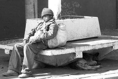 Keywords: ecuador banos ecuador homeless south america man and dog city street public bench sleeping black and white