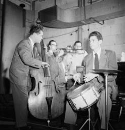 | Keywords: Eddie Safranski, Kai Winding, Stan Kenton, Pete Rugolo, and Shelly Manne, ca. Jan. 1947 (William P. Gottlieb 05041).jpg en Eddie Safranski Kai Winding Stan Kenton Pete Rugolo and Shelly Manne ca Jan 1947 Photograph by William P Gottlieb LOC-image music gottlieb 05041 http //lcweb2 loc gov/diglib/ihas/loc natlib gottlieb 05041/enlarge html page 1 section ver01 size 1024 from Creator William P Gottlieb 1947-01 PD-Gottlieb Photographs by William P Gottlieb Black and white photographs of the United States in the 1940s Stan Kenton Kai Winding Pete Rugolo Shelly Manne Percussion brushes Drum kit sticks and beaters Eddie Safranski |