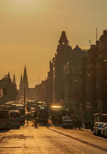 Keywords: edinburgh princess street shopping street transport cars buses street in edinburgh sunset