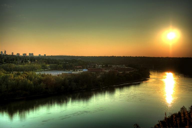 Keywords: edmonton canada saskatchewan river water reflections sunset sky clouds buildings skyline city cities trees outside dusk evening