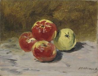 | Keywords: Édouard Manet - Quatre pommes.jpg Artwork creator Édouard Manet 1882 Oil on canvas cm 19 24 5 Private collection unknown accession number object history credit line RW I No 410 Sotheby's com PD-old-100 Still life paintings by Édouard Manet 1882 Images from Sotheby's 1880s still-life paintings 1882 paintings |