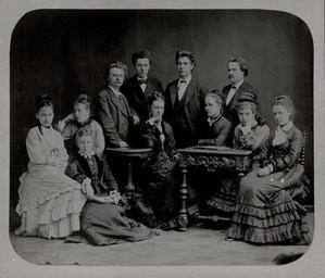 Keywords: bergenpubliclibrary edvard grieg edvardgrieg blackandwhite black and white Artist: unknown Date/place: 1876, Leipzig/Germany Subject: Edvard Grieg with friends in Leipzig 1876. Standing from left.: Edvard Grieg, Lauritz Grimstad, H. Ingelius, J. Haarklou. Sitting from left.: Bibba Dahl, Bergitte Oftedal, Randi Nilsen, Inger Holst, Ragna Gopleu, Anna Bjurstedt, Eline Aune Medium: photographic positive, B&W Notes: none Persistent URL: www.bergen.folkebibl.no/arkiv/grieg/fotografi/stor_leipzi... Original belongs to the Edvard Grieg Archives at Bergen Public Library Artist: unknown Date/place: 1876, Leipzig/Germany Subject: Edvard Grieg with friends in Leipzig 1876. Standing from left.: Edvard Grieg, Lauritz Grimstad, H. Ingelius, J. Haarklou. Sitting from left.: Bibba Dahl, Bergitte Oftedal, Randi Nilsen, Inger Holst, Ragna Gopleu, Anna Bjurstedt, Eline Aune Medium: photographic positive, B&W Notes: none Persistent URL: www.bergen.folkebibl.no/arkiv/grieg/fotografi/stor_leipzi... Original belongs to the Edvard Grieg Archives at Bergen Public Library |
