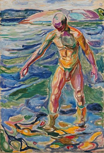 Keywords: Edvard Munch - Bathing Man (1918) NG.M.01699.jpg Artwork Creator Edvard Munch en Bathing Man <br /> 1918 oil canvas cm 160 110 The National Museum of Art Architecture and Design accession number NG M 01699 object history Donated by the artist in 1927 credit line http //samling nasjonalmuseet no/no/object/NG M 01699 Nasjonalmuseet / Lathion Jacques PD-Art PD-old-auto-1923 1944 NO 1910s paintings by Edvard Munch 1918 paintings from Norway 1918 paintings in Norway Paintings by Edvard Munch in the Nasjonalgalleriet Paintings of nude standing males Paintings of nude males in nature |