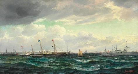 | Keywords: Edvard Skari - The British Royal yacht is received by the Danish Royal yacht.jpg Artwork creator Edvard Skari oil canvas cm 53 93 accession number object history credit line exhibition history Edv Skari ~ lower right signature http //www bruun-rasmussen dk/search do iid 300561260 lang en mode detail Bruun Rasmussen 04 06 2013 auction 841 lot 95 PD-old-auto-1923 1903 Paintings by Edvard Otto Rossing Skari oil paintings of seascapes 19th-century sailing ships in paintings Oil on canvas 19th-century paintings location missing |