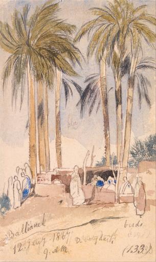 Keywords: Edward Lear - Ballianeh - Google Art Project.jpg inscribed in gray ink lower left Ballianeh 12 Jany 1867 9 AM ; in gray ink lower right 133 Not on View Watercolor with pen in brown and gray ink on moderately thick slightly textured cream wove paper palm trees sand figures representations landscape special url_id tQHNaThizy8WOA PD-old-100-1923 1888 Egypt by Edward Lear Google Art Project works by Edward Lear