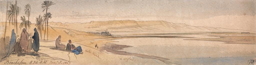Keywords: Edward Lear - Benihassan - Google Art Project.jpg inscribedd in brown ink lower left Benihassan 8 30 AM Jany 5 1867 ; in brown ink lower right 73 ; verso in graphite center right 82 encircled Not on View Watercolor with pen in brown ink over graphite on medium moderately textured wove paper mounted on thick moderately textured cream wove paper sky seated palm trees sand water river figures representations landscape special url_id IAGRNHMPqpoxWw PD-old-100-1923 1888 Egypt by Edward Lear Nile in art Google Art Project works by Edward Lear Beni Hassan 1867