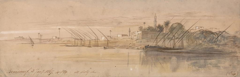 | Keywords: Edward Lear - Benisouef - Google Art Project.jpg inscribed in brown ink lower left Benisouef 2 Jany 1867 4 PM ; in brown ink lower right 34 Not on View Watercolor with pen in brown ink and gouche over graphite on medium slightly textured wove paper mounted on thick slightly textured cream wove paper sky palm trees water minarets river riverbank buildings marine art boats special url_id LwFzoO0rrfbxpg PD-old-100-1923 1888 Egypt by Edward Lear Nile in art Google Art Project works by Edward Lear |