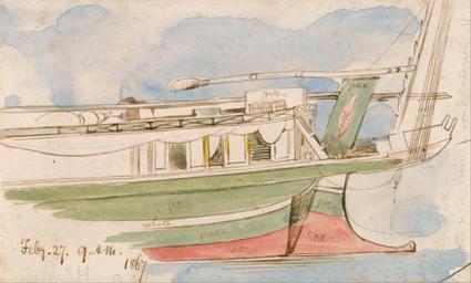 Keywords: Edward Lear - Boat on the Nile - Google Art Project (2425538).jpg inscribed in brown ink lower left Feby 27 9 AM 1867 ; Verso in graphite center 153 up Lowest Not on View Watercolor with pen in brown ink over graphite on medium sligtly textured cream wove paper windows river marine art flag boat special url_id twH9T2GzY6MzUw PD-old-100-1923 1888 Egypt by Edward Lear Nile in art Google Art Project works by Edward Lear Egyptian feluccas in art |
