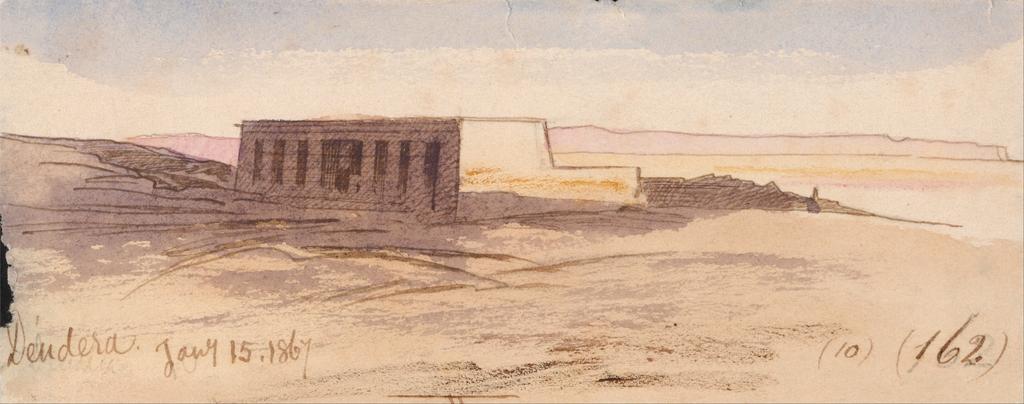 Keywords: Edward Lear - Dendera - Google Art Project (2415544).jpg inscribed in brown ink lower left Dendera Jany 15 1867 ; in brown ink lower right 10 162 ; Verso in graphite center 37 up next above lowest left Not on View Watercolor with pen in brown ink over graphite on medium slightly textured cream wove paper architectural subject sand temple ruins landscape desert special url_id KQEmUYZ01TwWQQ PD-old-100-1923 1888 Egypt by Edward Lear Dendera Google Art Project works by Edward Lear