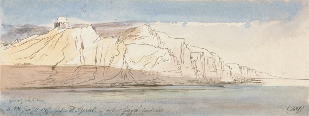 Keywords: Edward Lear - Gebel el Azerat (below Girgeh, east side) - Google Art Project.jpg inscribed in gray ink lower left 4 PM Jany 11 1867 Gebel El Azerat - below Gergeh East side ; in gray ink lower right 131 ; Verso in graphite upper lsft 30 up ; in graphite center next below Top Not on View Watercolor in pen with gray and brown ink over graphite on moderately thick slightly textured cream wove paper sky water cliffs river riverbank landscape special url_id KgGco1bAi9h8ug PD-old-100-1923 1888 Egypt by Edward Lear Nile in art Google Art Project works by Edward Lear |